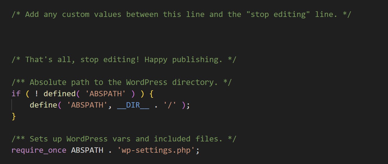 Ce bloc ne doit jamais être déplacé, modifié ou supprimé. Il marque la fin de la configuration manuelle dans wp-config.php. Toute constante personnalisée ou valeur ajoutée par l’utilisateur doit impérativement être placée avant cette partie, comme le précise le commentaire : /* Add any custom values between this line and the "stop editing" line. */.